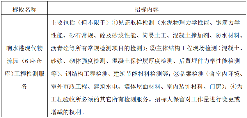 1、項目名稱:響水港現(xiàn)代物流園(6座倉庫)工程檢測服務(wù)。