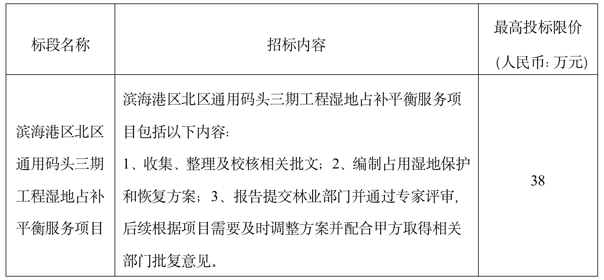 (5)項目標段劃分:濱海港區北區通用碼頭三期工程濕地占補平衡服務項目共劃分1個標段,標段信息如下: