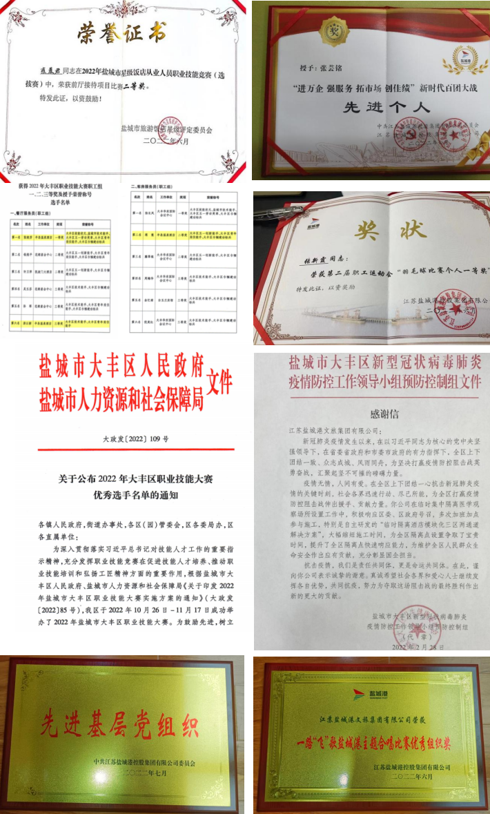 2022年,文旅集團黨總支和港泊半島酒店支部被評為“先進基層黨組織”。文旅集團洪兵、韓世軍在鹽城港集團“七一”表彰中獲評優秀共產黨員稱號,蔣雷獲評優秀共青團員稱號。港泊半島酒店職工張曉芳、湯以新、蔣慧等同志分別獲得大豐區技能狀元、鹽城市技術能手、大豐區五一勞動獎章、大豐區青年崗位能手、大豐區巾幗建功標兵稱號。