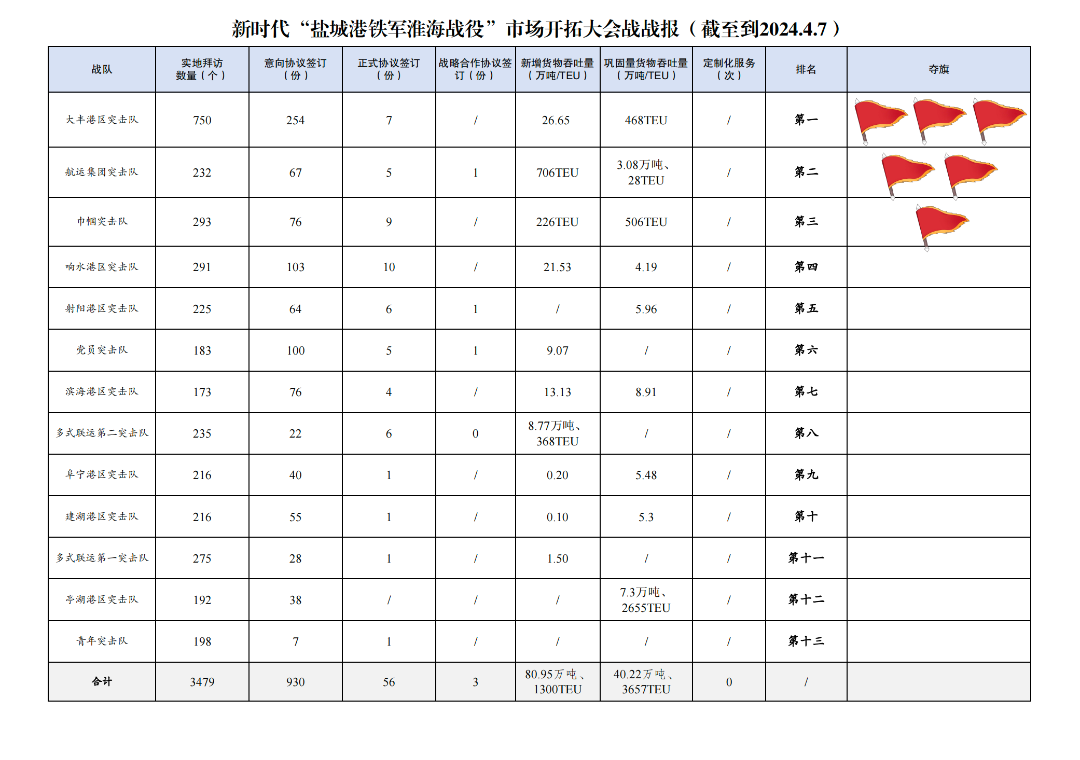 2.簽訂意向協議數量930份:其中大豐港區突擊隊254份,響水港區突擊隊103份,黨員突擊隊100份,巾幗突擊隊76份,濱海港區突擊隊76份,航運集團突擊隊67份,射陽港區突擊隊64份,建湖港區突擊隊55份,阜寧港區突擊隊40份,亭湖港區突擊隊38份,多式聯運第一突擊隊28份,多式聯運第二突擊隊22份,青年突擊隊7份。