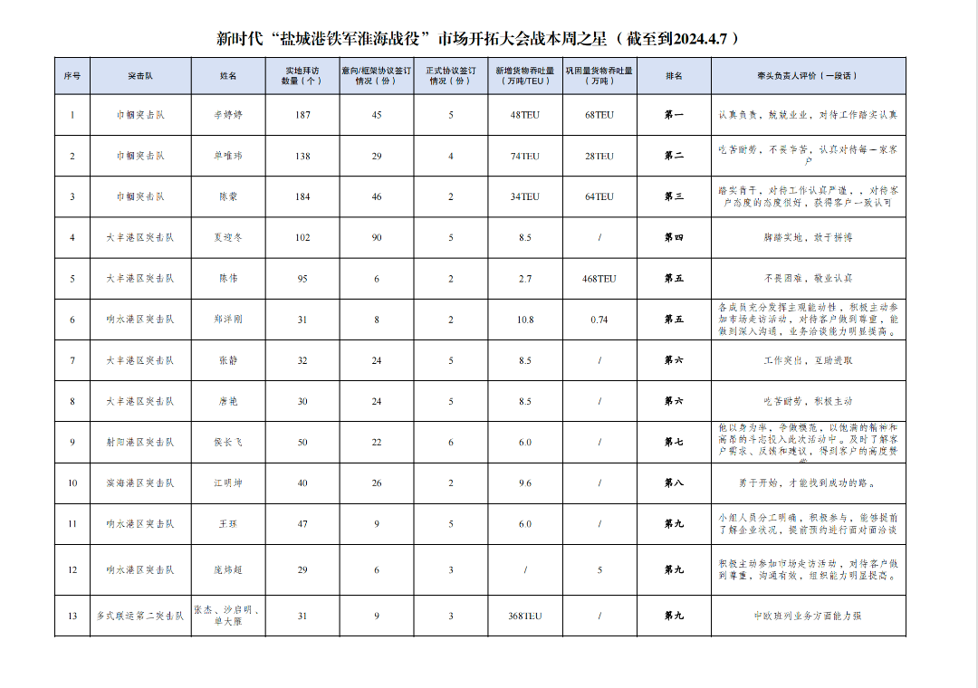 1.累計拜訪客戶數量3479家:其中大豐港區突擊隊750家,巾幗突擊隊293家,響水港區突擊隊291家,多式聯運第一突擊隊275家,多式聯運第二突擊隊235家,航運集團突擊隊232家,射陽港區突擊隊225家,阜寧港區突擊隊216家,建湖港區突擊隊216家,青年突擊隊198家,亭湖港區突擊隊192家,黨員突擊隊183家,濱海港區突擊隊173家。