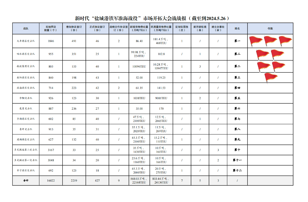2.簽訂意向協議數量2219份:其中大豐港區突擊隊491份,響水港區突擊隊351份,黨員突擊隊236份,濱海港區突擊隊223份,射陽港區突擊隊198份,航運集團突擊隊155份,建湖港區突擊隊132份,巾幗突擊隊123份,阜寧港區突擊隊123份,亭湖港區突擊隊85份,青年突擊隊35份,多式聯運第一突擊隊34份,多式聯運第二突擊隊33份。