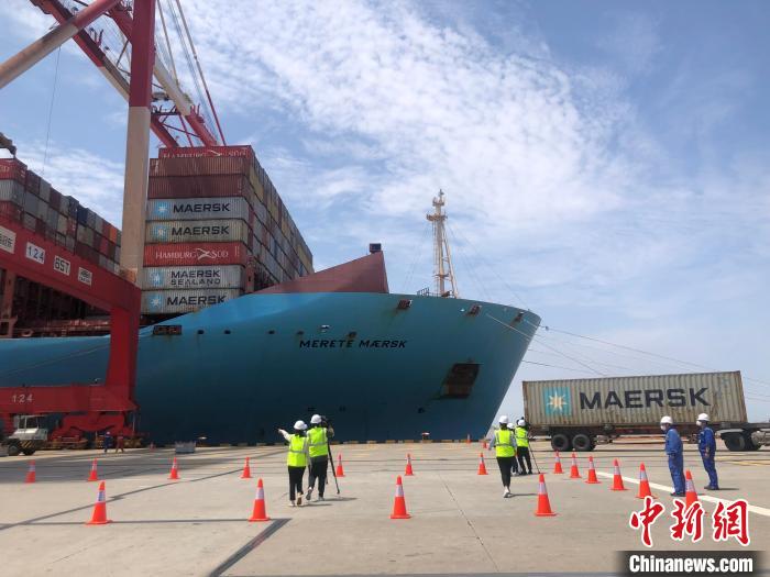 5月31日,27個(gè)從加拿大溫哥華進(jìn)口至中國(guó)的集裝箱,在上海洋山深水港碼頭被裝上“美若馬士基”輪。上海自貿(mào)區(qū)臨港新片區(qū)官方供圖