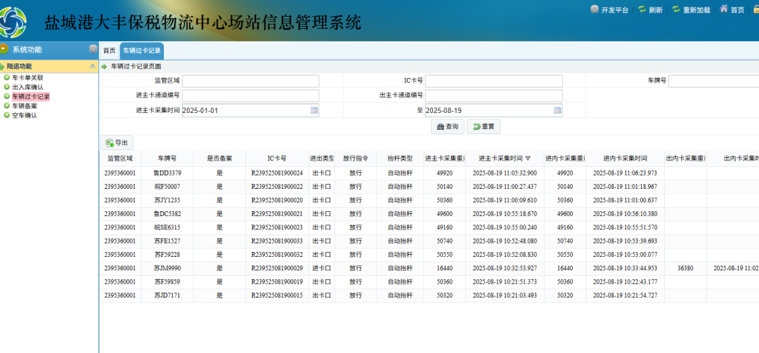 積極探索創新路徑,聚焦系統智能化升級,通過對場站系統進行深度智能化改造,集成車卡關聯、堆場管理、監管倉管理、基礎資料管理等功能模塊,實現了實際重量卡口自動填報、自動申報、車卡自動關聯及到貨確認的全流程自動化,作業效率顯著提升40%,數據準確率高達99.9%,為保稅物流業務的高效運作提供了堅實的技術支撐。