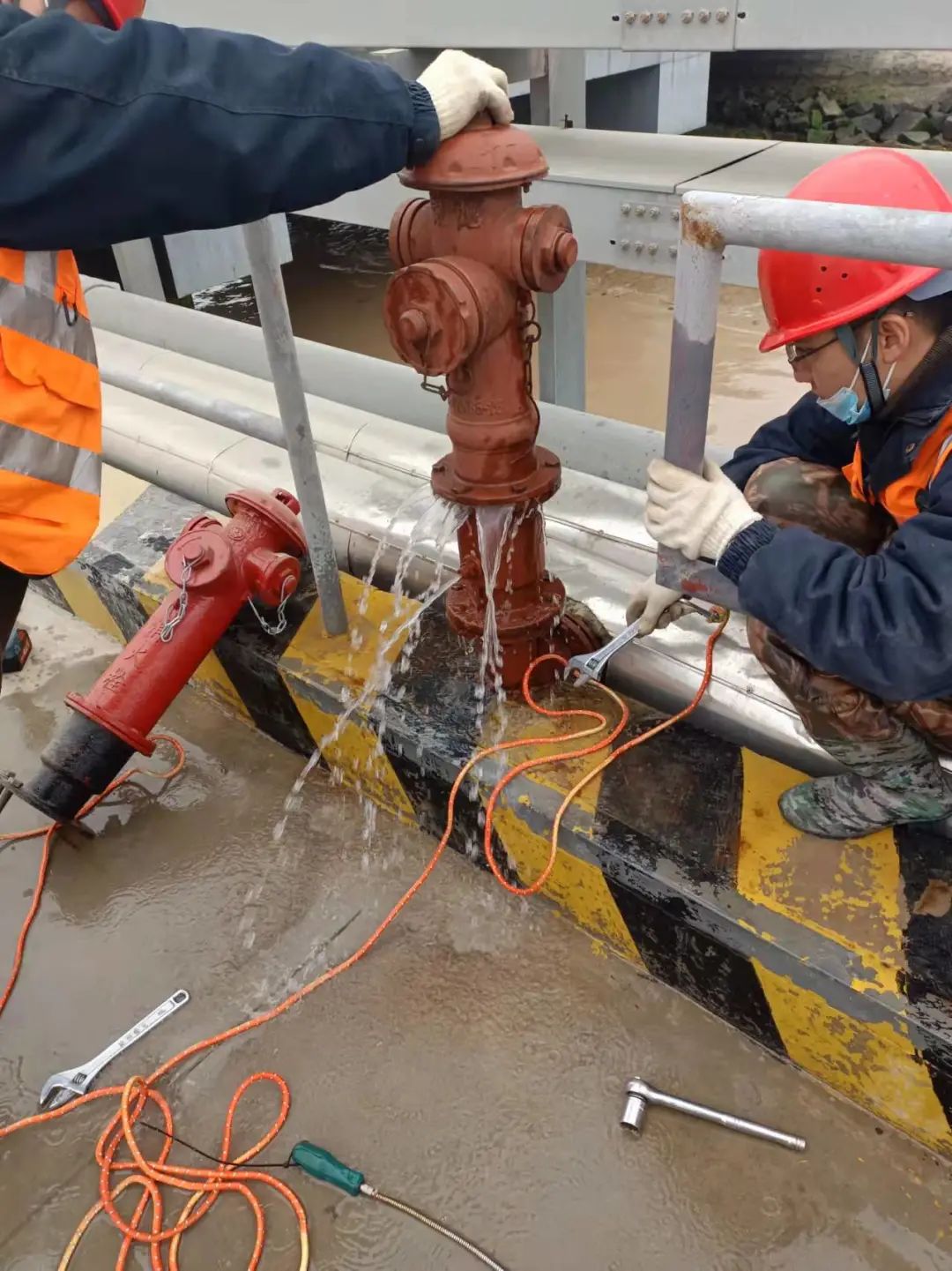 本次演練模擬惡劣天氣下港區碼頭消火栓爆裂,泄露出的水在碼頭路面結出冰面,并對往來車輛、人員造成了極大的安全隱患。港區巡查員發現隱患后,迅速向上級匯報并啟動應急預案,對破損消火栓進行維修和更換,并加裝防寒保溫套,同時對碼頭面結冰區域拋灑融雪劑。經過近半小時搶修,消防栓更換到位并停止漏水,碼頭面冰層消融,安全隱患排除。