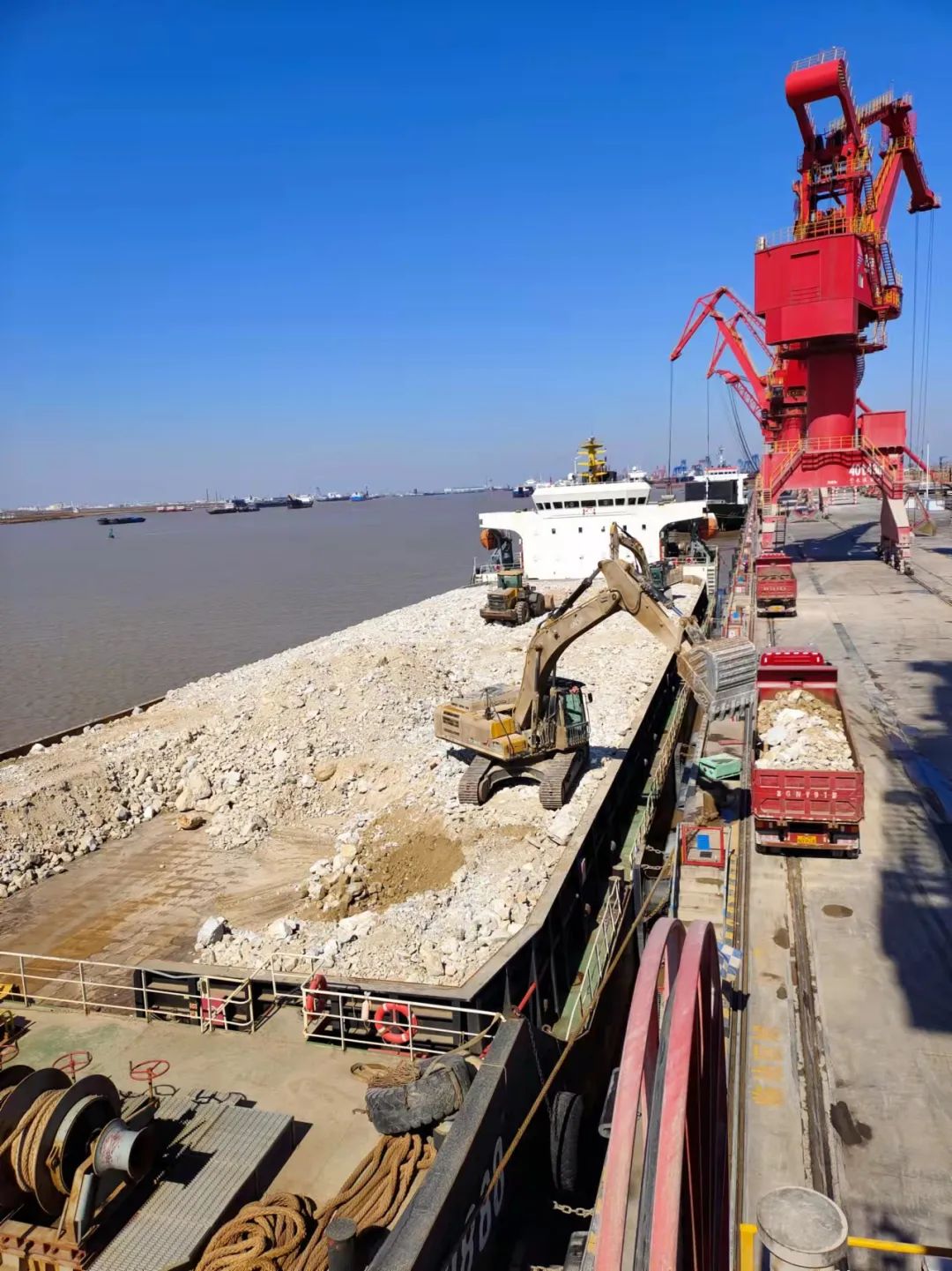 公司是樹,客戶是根,服務是本。響水港區生產團隊一如既往地重視該類大輪的生產組織,在“鴻運9888”甲板船作業過程中重點強化了相應的安全監管,團隊提前對大輪各項參數進行詳細了解,在靠泊時避開了門機高壓電纜區域,及時在接卸區域碼頭前沿纜坑處鋪設了相應的鋼板,確保整個裝卸過程安全。由于自卸船舶吃水較淺,受灌河潮汐影響也相對較小,因此和港區其他海輪在一定程度上可以進行互補,有效提升碼頭利用率,進一步提升了港口作業及應收能力。
