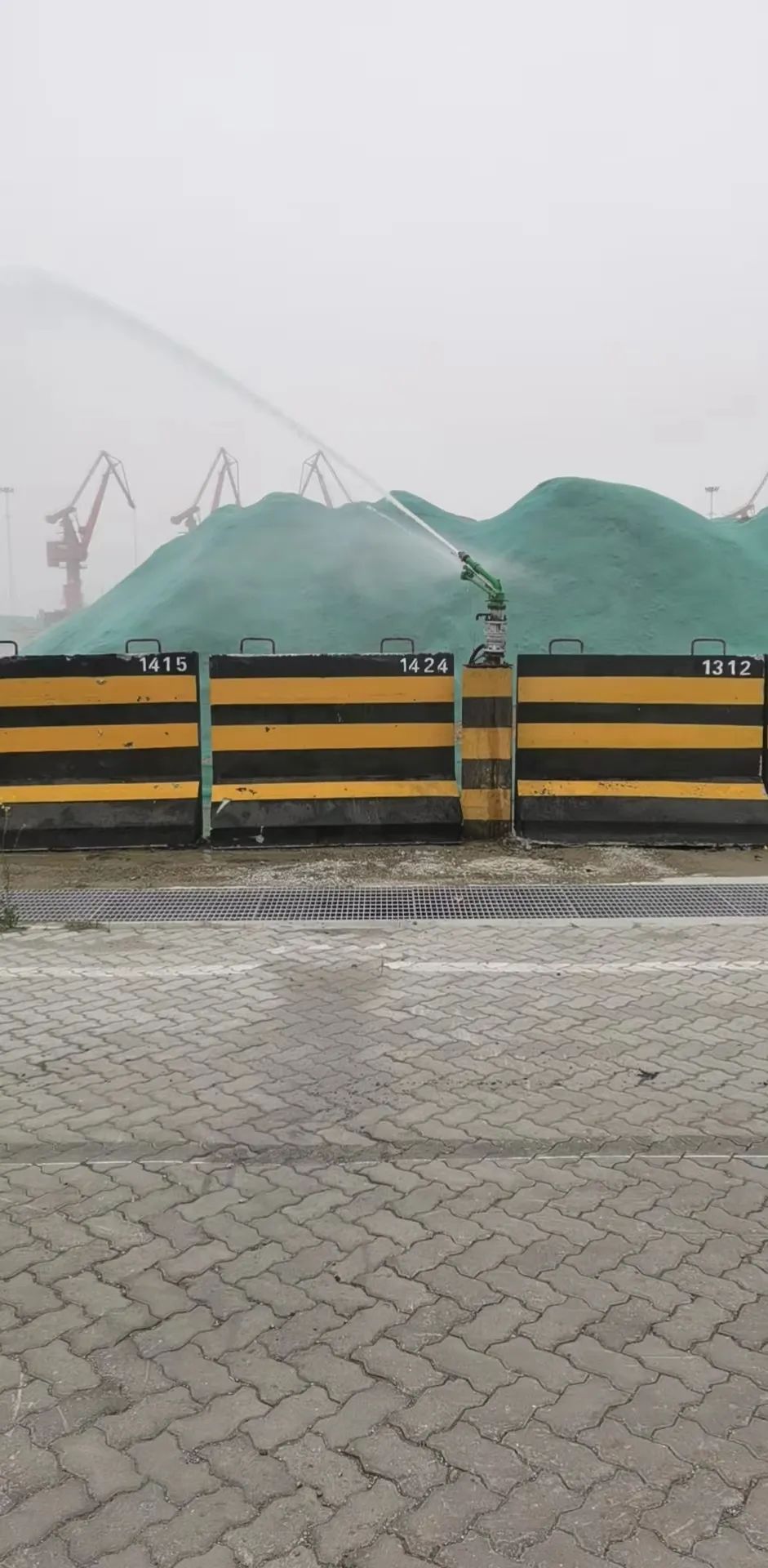 (倉(cāng)儲(chǔ)部及時(shí)開啟堆場(chǎng)噴淋設(shè)備,對(duì)苫蓋貨物進(jìn)行抑塵噴灑)