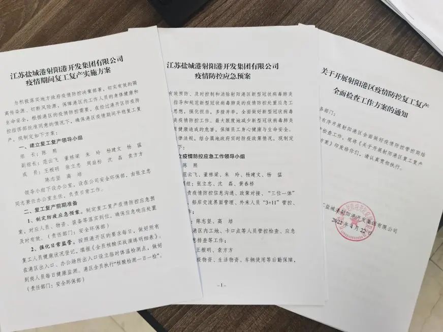 射陽港區堅決貫徹執行“三位一體”管控的總體要求,在復工復產前,邀請第三方專家會同各部門對港區進行一次全面的安全、環保、疫情防控大檢查,對檢查出的隱患立行立改,落實專人跟蹤進行閉環整改落實,確保復工復產、疫情防控安全穩定。