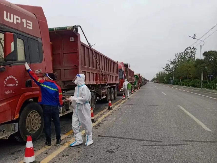 4月25日,射陽港區迎來了復工復產的第一天,港區門口運輸車輛排起了長龍,工作人員嚴格按照疫情防控要求進行登記檢查,進港車輛貼上封條,并進行全面消殺,確保從源頭上把牢疫情防控關口。