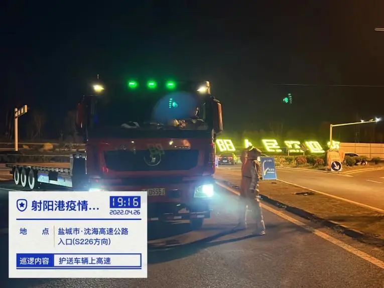 4月26日,接到客戶運輸車輛到達射陽高速出口檢查點,請求協助的電話后,港區立刻成立專項小組穿戴好防護服至高速口開展全程配套服務,及時將運輸車輛引導到港區。