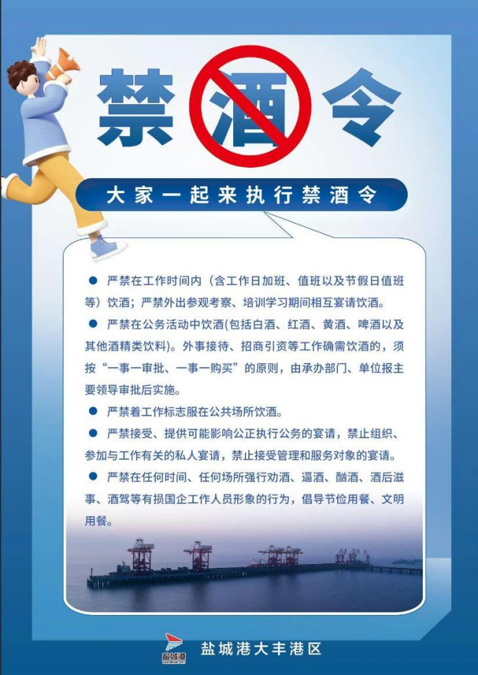為貫徹全面從嚴(yán)治黨要求,加強(qiáng)工作紀(jì)律,營造風(fēng)清氣正的良好環(huán)境,鹽城港大豐港區(qū)頒布最新禁酒令,要求大豐港區(qū)全體干部職工在工作時(shí)間、公務(wù)活動等情況下,一律禁止飲酒,以維護(hù)鹽城港集團(tuán)員工的良好形象。