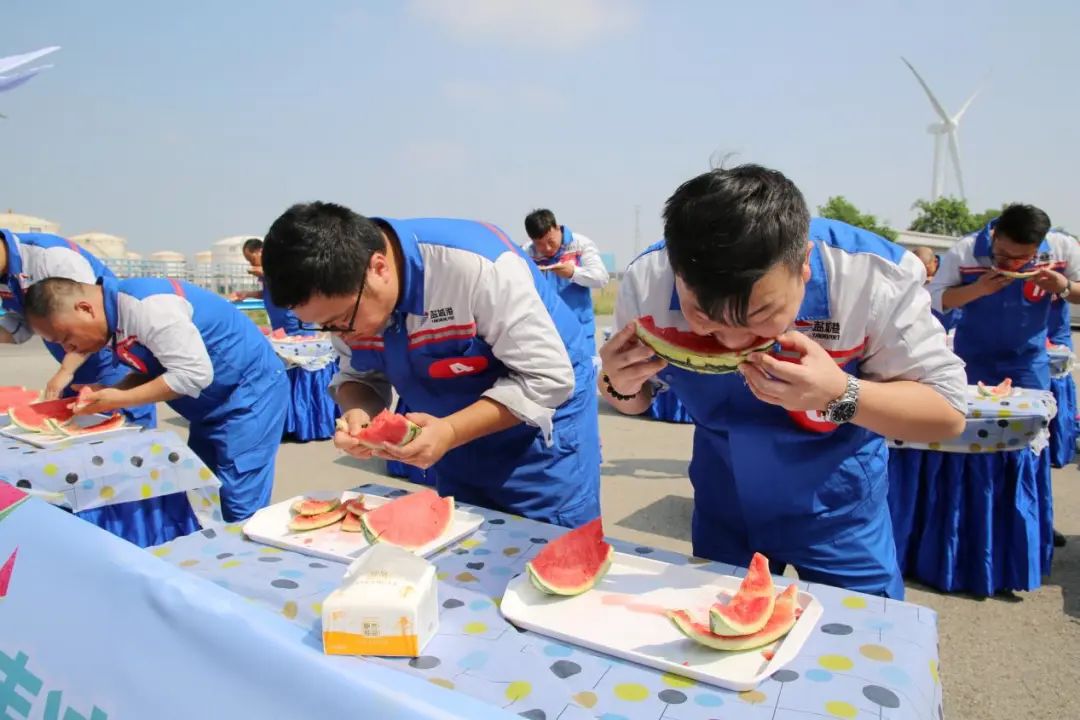 剛剛過去了小暑,大暑又匆忙到來,地表熱力值持續爆表,大豐港區一線職工不懼酷暑,堅守一線,與炎熱打上了一場持久戰。在這炎熱的酷暑時節,鹽城港大豐港區滿載著“一家人、在一起、手足情、過日子”的深情關愛,給一線的職工帶來了一場西瓜的狂歡之旅,在大豐港區石化碼頭舉行“瓜分甜蜜清涼一夏”吃西瓜比賽,和順國貿、中南匯、油品化工碼頭、成品油一線職工代表參賽。