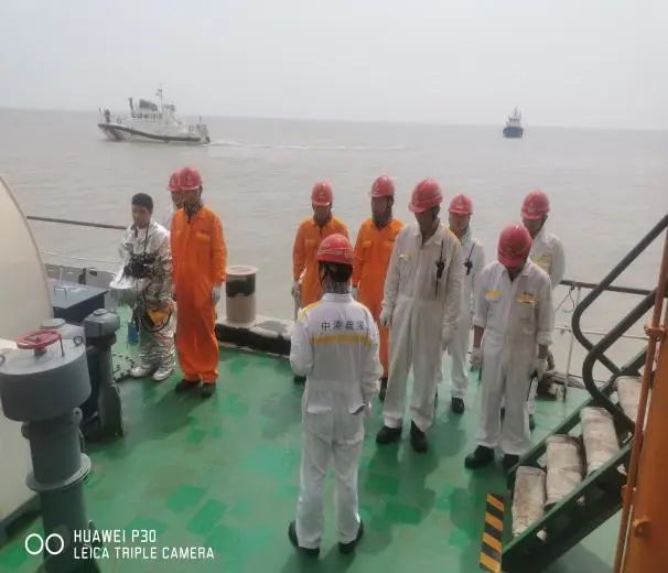 隨后,溢油演習正式開始,“左舷船中錨機壓管漏油啦!”“新海鯉”輪船長接報后立即拉響了防油污警報,同時船長通過全船廣播告知溢油地點,根據應變部署要求,立即切斷漏油源頭,控制油污流入海面,清理甲板現場污油。同時上報施工項目部,項目部組織“航工301”、“茸洋168”、“海盛189”輪立即趕赴灌河口航道轉運點參與新海鯉輪的水面油污清理工作,通過各輪齊心協作,成功完成清污工作。