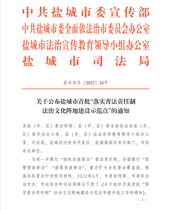 近期,由鹽城市委宣傳部、市委依法治市辦、市法宣辦、司法局4個部門單位發布關于公布鹽城市首批“落實普法責任制法治文化陣地建設示范點”的通知,江蘇鹽城港射陽港開發集團有限公司榮獲相關稱號。