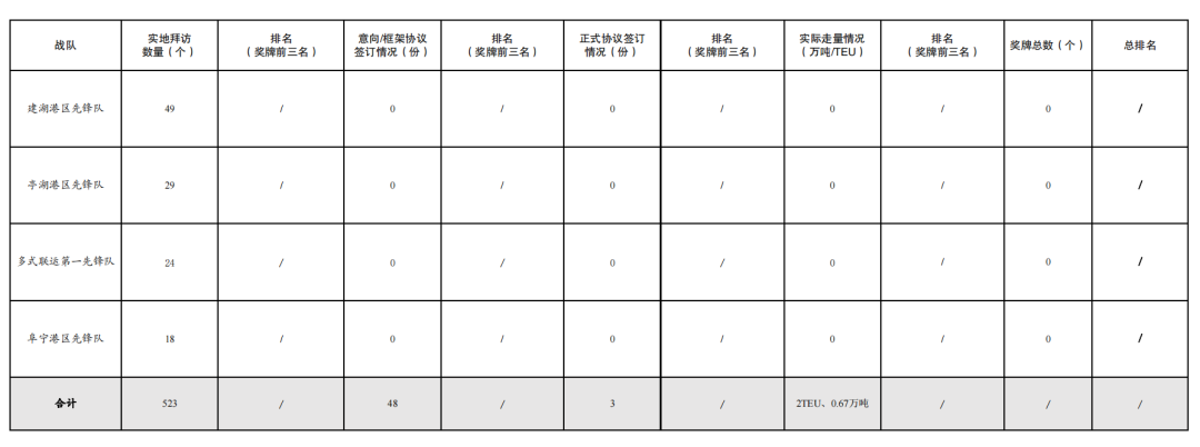 2.簽訂意向/框架協(xié)議數(shù)量48份:其中巾幗先鋒隊14份,黨員先鋒隊11份,濱海港區(qū)先鋒隊6份,響水港區(qū)先鋒隊5份,多式聯(lián)運第二先鋒隊4份,航運集團先鋒隊4份,青年先鋒隊2份,射陽港區(qū)先鋒隊1份,大豐港區(qū)先鋒隊1份。