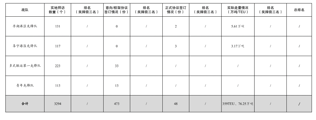 活動開展以來,累計拜訪客戶數量3294家,簽訂意向/框架協議數量473份,簽訂正式協議48份,實際走量359TEU、76.25萬噸。