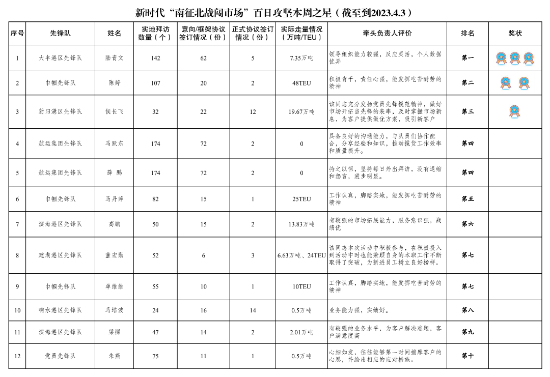 第一名:大豐港區先鋒隊 陸青文(拜訪客戶142家,簽訂意向協議62份,簽訂正式協議5份,實際走量7.35萬噸)