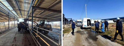 棚舍內(nèi),裝載機(jī)往來穿梭,轟鳴聲不斷。工作人員加班加點清理牛糞并運(yùn)往糞污處理區(qū),對牛棚進(jìn)行全面清掃。身著防護(hù)服的消毒人員,手持專業(yè)消殺設(shè)備,對場地、棚舍、通道以及各類設(shè)備進(jìn)行全方位消毒,為種牛營造一個安全、衛(wèi)生的環(huán)境。