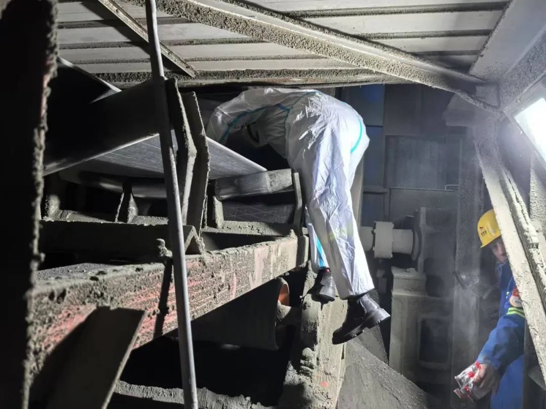 ?當晚7時50分,碼頭提升機因物料塊徑過大突發堵塞,皮帶機被迫停轉。刺耳的警報聲中,應急機制瞬間響應,機修班組及技術、調度、安全人員5分鐘內全員抵達作業現場。維修人員蜷縮在狹窄的進料口,借著手電光疏通堵料;調度團隊緊急調整船舶作業時序;安全員緊盯每個作業細節。寒夜里,工具敲擊聲與對講機指令聲交織成攻堅戰的號角。用時1小時10分鐘,晚上9點設備恢復運轉。但在50分鐘后,二次堵料警報再度響起,維修人員未及休整便再度投入戰斗。