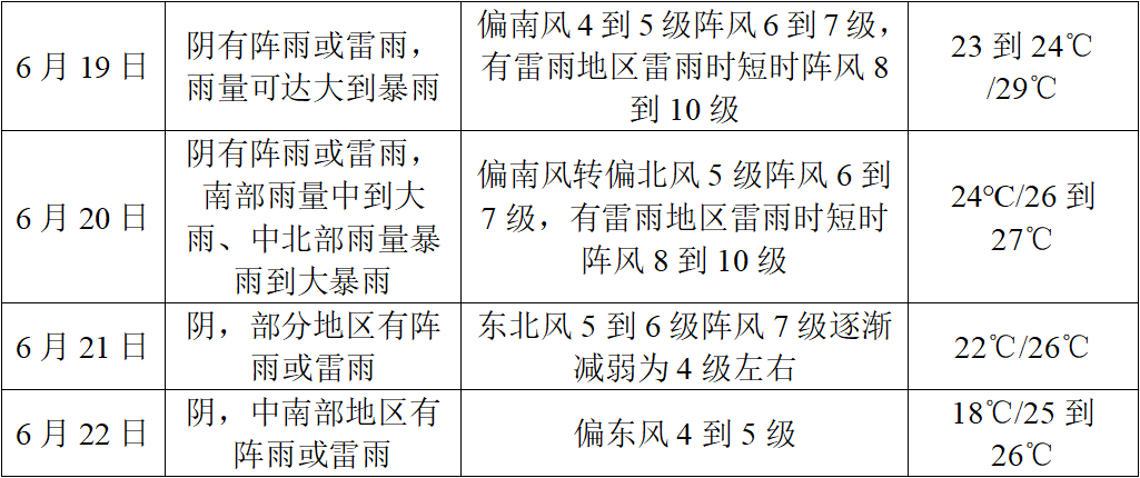 19-22日過程雨量:80~150毫米,局部180~220毫米,雨量主要集中在19-20日,21日雨帶逐漸南壓,22日降水主要在中南部地區。降雨期間局地可能伴有雷電、小時雨強40~70毫米的短時強降水和8~10級雷暴大風等強對流天氣。