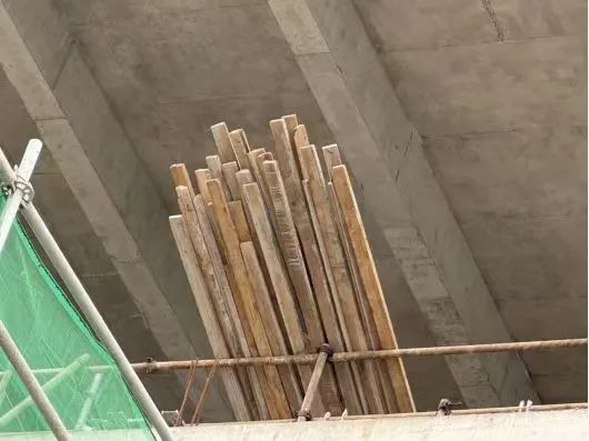混凝土結(jié)構(gòu)施工區(qū)域,淺棕色木方違規(guī)傾斜堆放于臨邊圍擋處,遇外力(如碰撞、大風(fēng))易發(fā)生墜落,威脅下方作業(yè)人員安全。