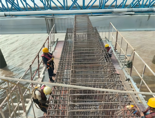 走進糧食碼頭新建泊位及配套設施項目工地,施工人員正頂著烈日進行引橋混凝土澆筑作業。“我們從項目開工就立下了‘進度不滯后、質量不打折’的軍令狀。”項目負責人介紹,為確保工程按計劃推進,團隊早在開工初期就聯合施工單位、監理部門制定了詳細的施工計劃,將工期細化到每周、每日,通過“倒排工期”的方式壓實責任。針對沿海地區夏季多臺風、暴雨的特點,碼頭建立了一套“預警——響應——切換”的應急管理體系。這種提前備好應急預案、快速切換施工安排的模式,為工程穩步推進筑起了“防護墻”。