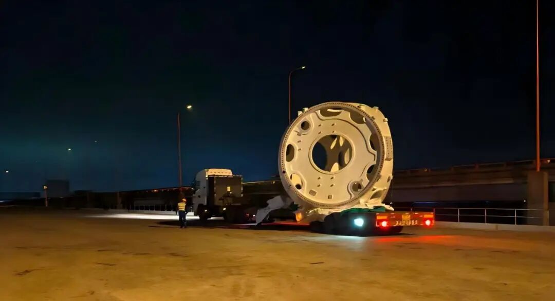 此次運輸的輪轂、底座等風電設備核心部件,單臺重達50噸、高5.7米、寬5.4米。面對來勢洶洶的臺風“樺加沙”,運輸工作面臨著前所未有的挑戰。大豐物流大件組,第一時間啟動一級應急預案,以“分秒必爭、萬無一失”為目標展開行動。