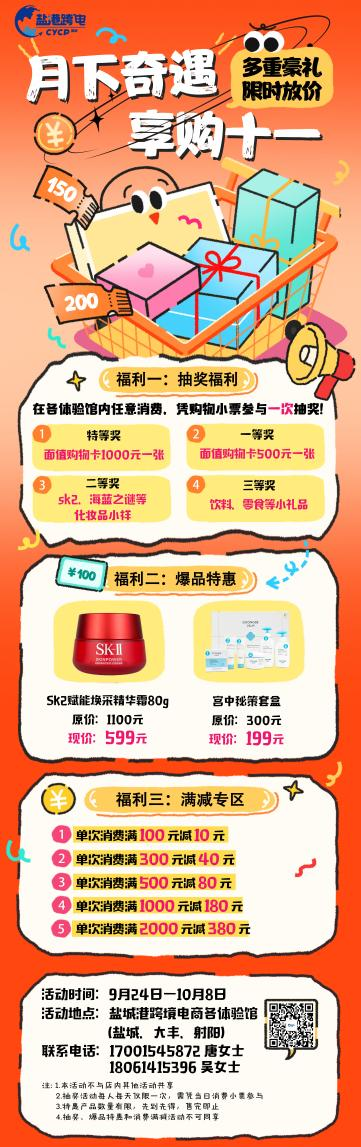 莎士比亞跨境電商國際商貿(mào)小鎮(zhèn)將于2025年9月24日至10月8日推出以“月下奇遇,享購十一”為主題的系列促銷活動。活動期間,消費者可在鹽城、大豐、射陽三地的跨境電商體驗館享受多重福利:消費即可參與100%中獎抽獎,獎品涵蓋千元購物卡、熱門美妝小樣等;單筆消費滿100元起即可參與多檔滿減優(yōu)惠,最高立減380元;更有爆款單品直降促銷,如SK2賦能煥采精華霜由原價1100元優(yōu)惠至599元,誠意回饋顧客。本次活動通過線上線下多渠道聯(lián)動宣傳,并提前備足貨源、優(yōu)化服務(wù)流程,力求為消費者帶來優(yōu)質(zhì)、便捷的購物體驗,進一步激發(fā)節(jié)日消費市場活力。