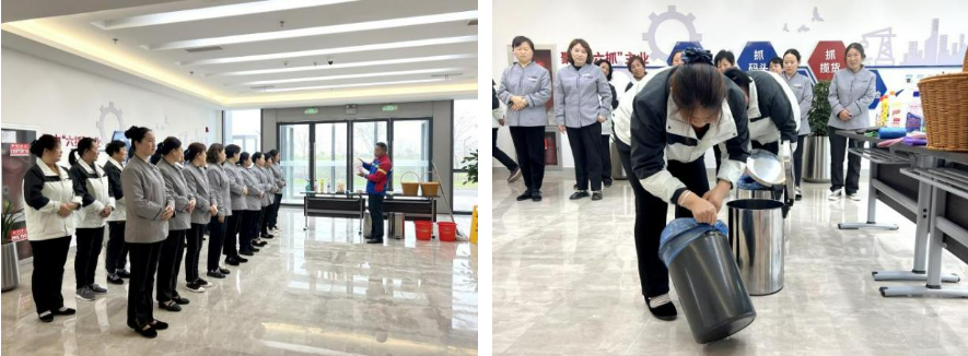 培訓現場通過手把手教、一對一帶,緊盯員工專業技能的短板、漏洞、弱項,系統全面地將常用操作流程、特種設備保養等專業保潔技能進行講解和示范。通過更規范、專業、高效的工作方法,強化員工職業技能,提升物業服務水平。